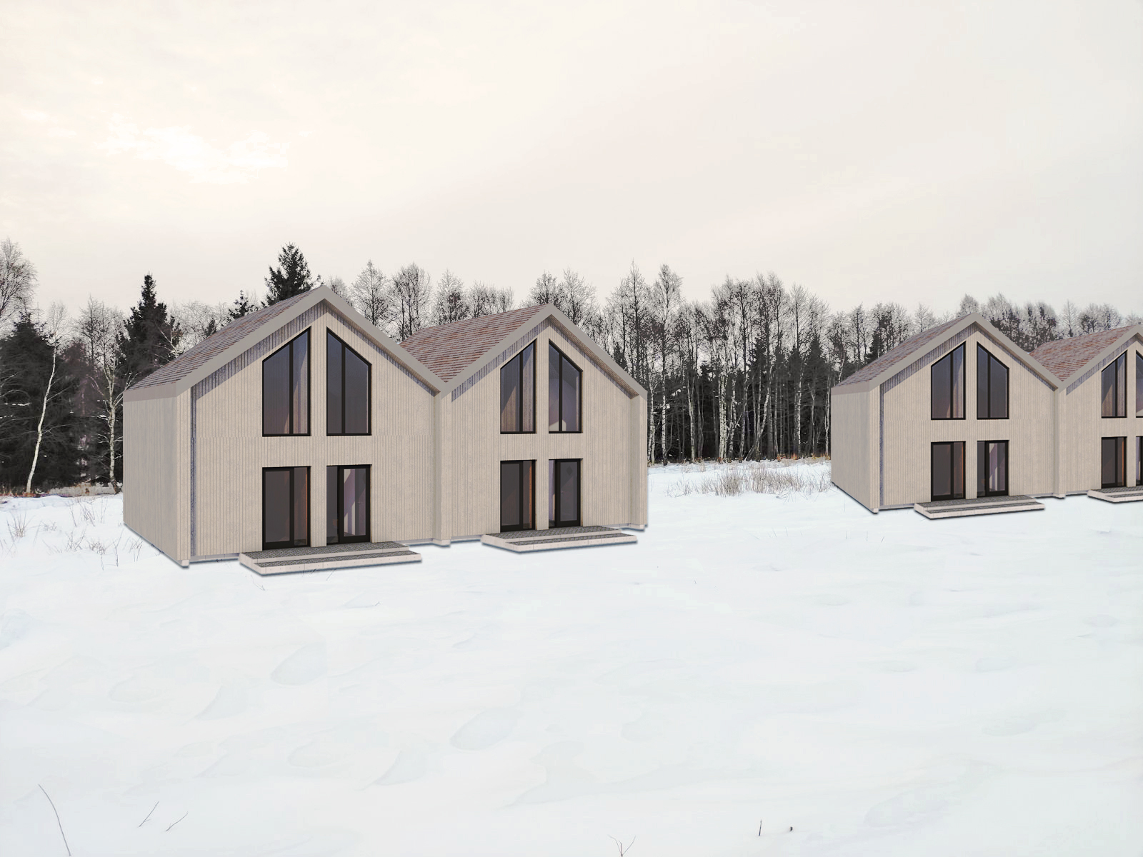 Parengti keturių po 90.16 m² bendro ploto dvibučių gyvenamųjų namų, blokuotų po du, pagalbinio ūkio paskirties pastato (sandėliuko), statybos projekto projektiniai pasiūlymai.