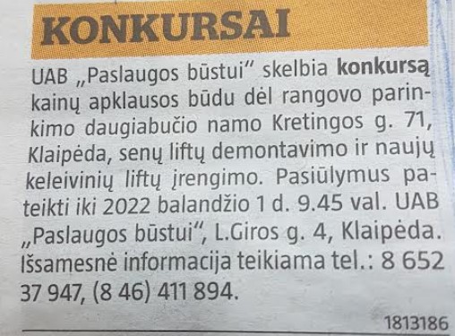 Skelbiamas konkursas daugiabučio namo senų liftų demontavimui ir naujų keleivinių įrengimui. Pasiūlymai iki 2022-04-01.